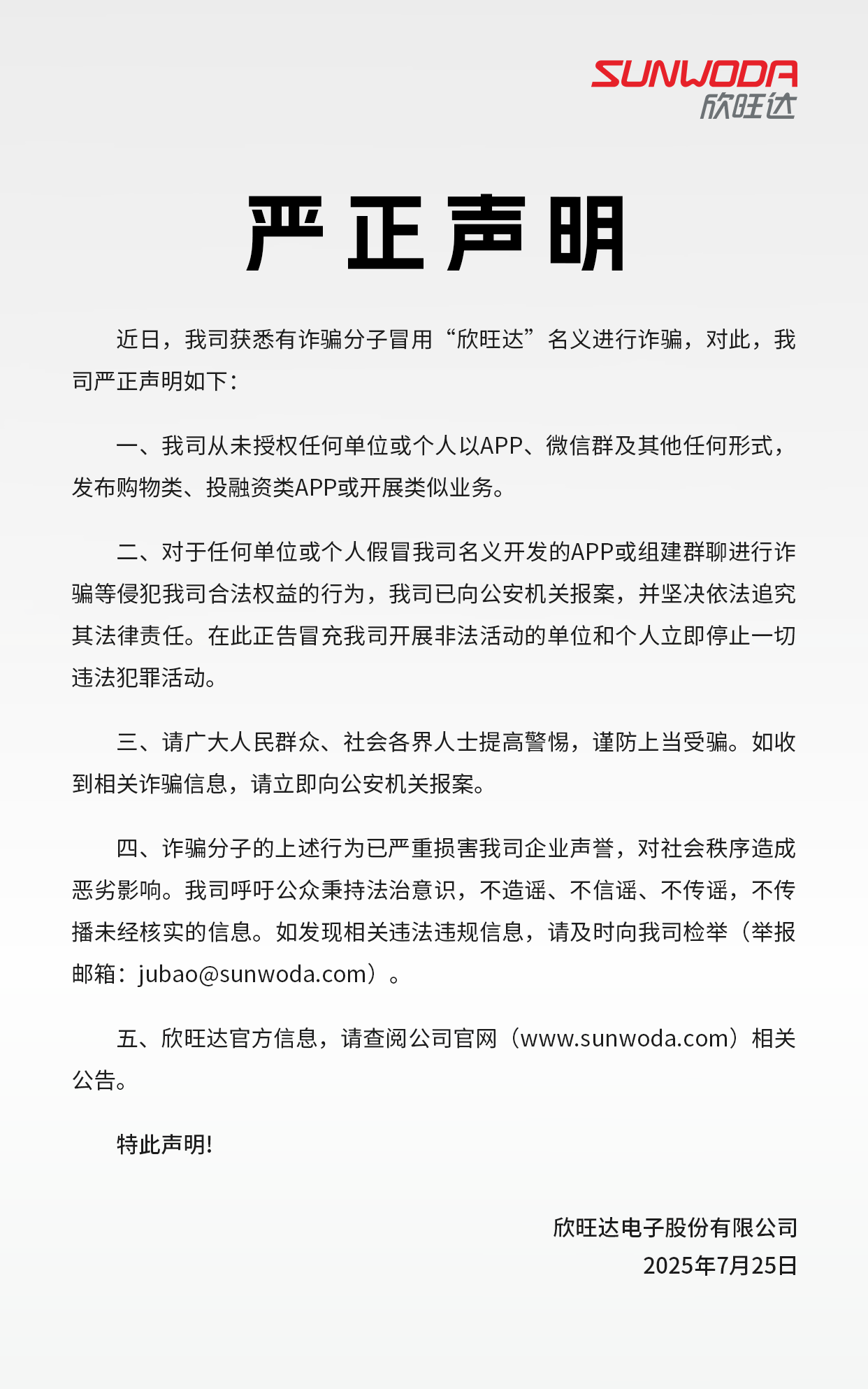 關于詐(zha)騙(pian)分子冒用(yong)欣旺達名(ming)義進(jin)行詐(zha)騙(pian)的聲明
